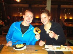 tuesday night after meeting with the tuesday run group, my buddy janelle, her “couch-surfing” roommate julia, and i headed out for a quick drink @ Wurst. I had never been there before, and quite enjoyed it! janelle ordered pretzels (omg i love bread), julia ordered some kind of sliced meatloaf with bread and mustard, and i enjoyed my fav – spaetzle. mmm.